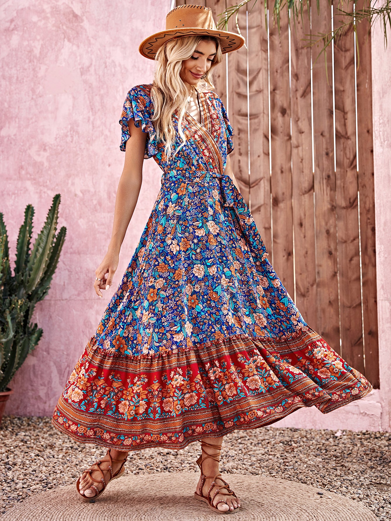 Fashion Women V-Neck Long Sleeve Maxi Dress Casual A-Line Belt Elegant Party Outing Autumn Winter Urban Floral Print Midi Dress
